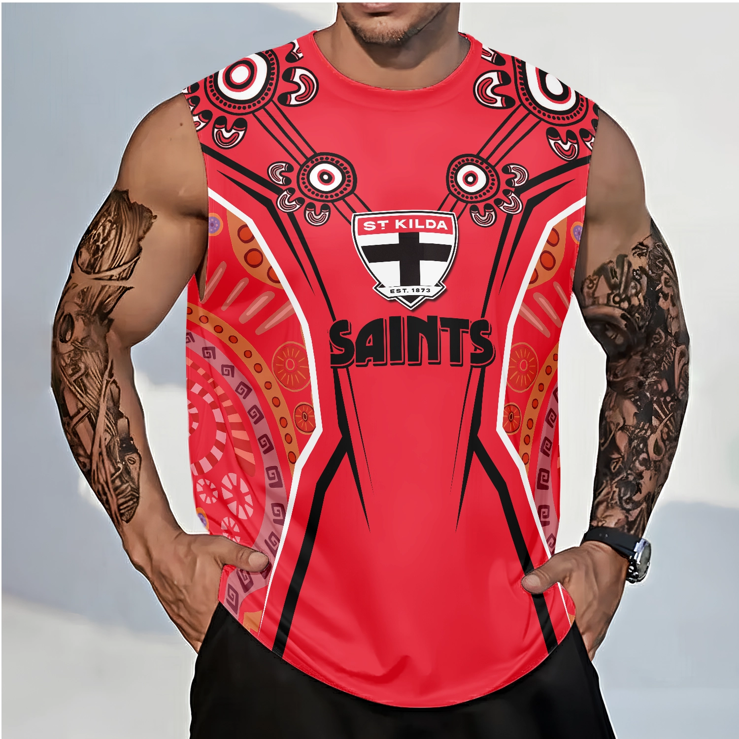 Make a bold statement with this tank top, featuring striking, dynamic patterns that radiate confidence and style.